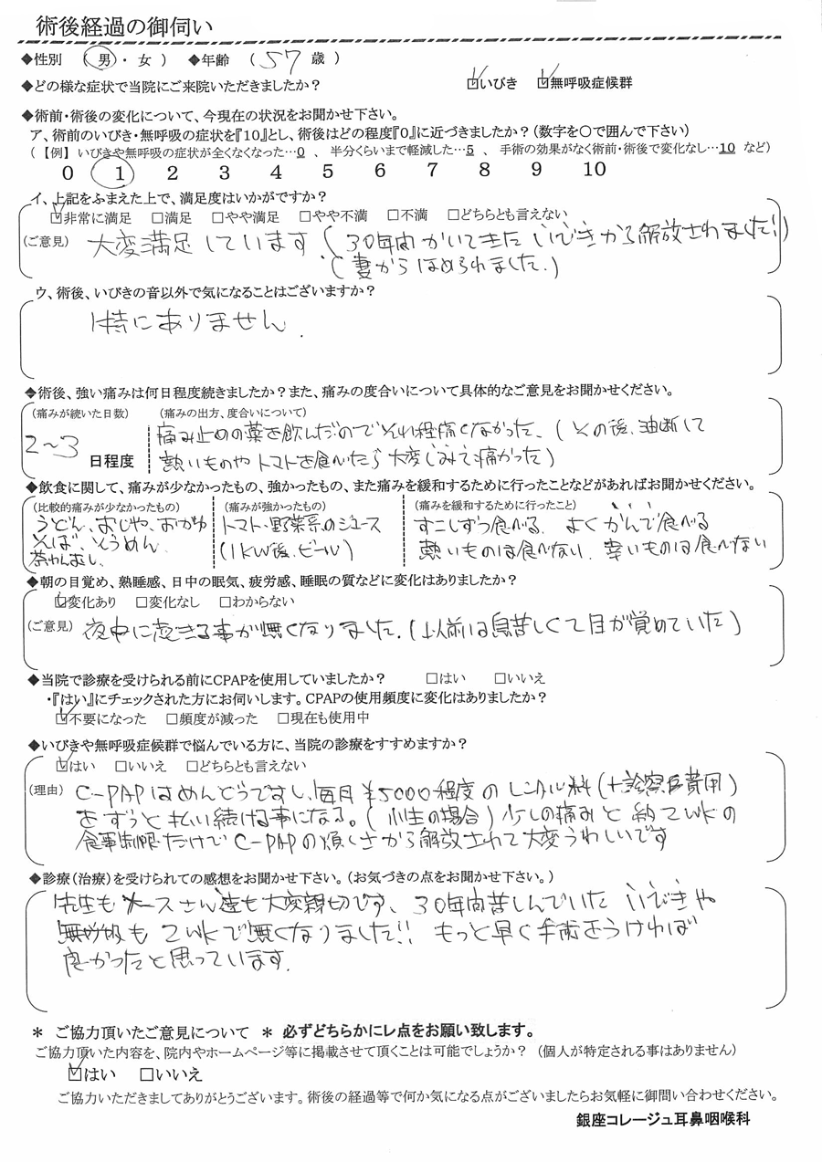 (小生の場合)少しの痛みと約2wの食事制限だけで、CPAPの煩わしさから解放されて大変嬉しいです。