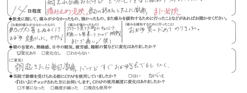 (ご意見) 朝起きたら、毎回激痛。だけど、直ぐお粥等を食べると引く。