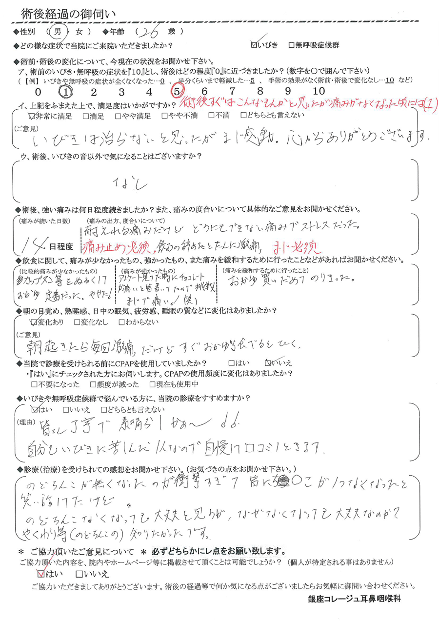 (ご意見) いびきは治らないと思ったが、マジ感動。心から有難うございます。