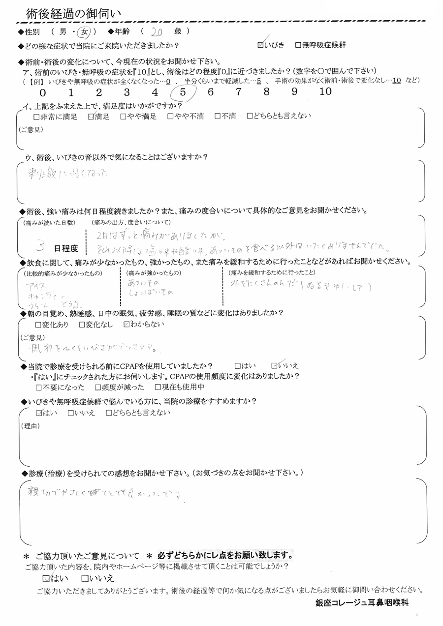 ア, 術前のいびき・無呼吸の症状を『10』だったとすると、術後はどの程度になりましたか? 5】
