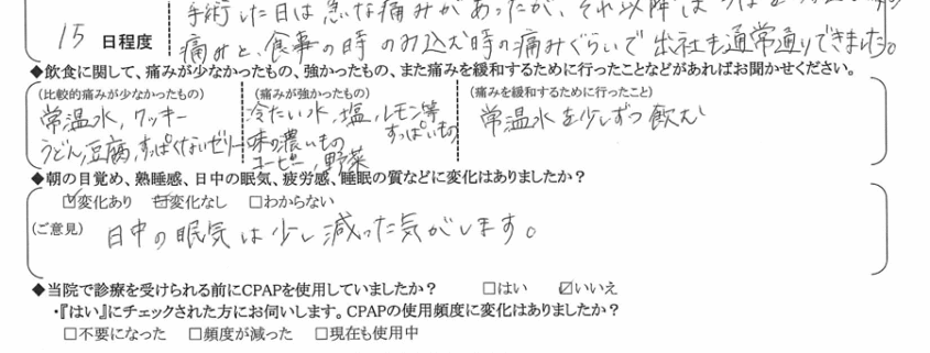 (痛みの程度について) 手術した日は急な痛みがあったが、それ以降は唾を飲み込む時の痛みと、食事を飲み込む時の