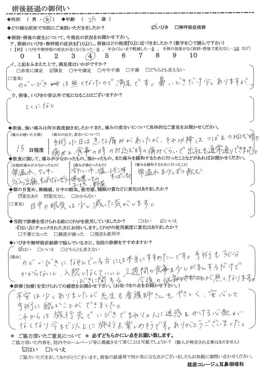 (理由) 喉のいびきに悩んでいる方には本当に勧めたいです。手術も30分かからないし、入院しなくていいし、2週間の食事を少し我慢するだけでいびきに関する今後の悩みが無くなります。