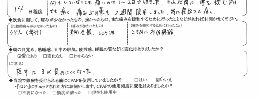 (痛みの程度について) 何もしていなくても痛いのは1~2日で、それ以降は唾を飲むだけでも痛く、痛み止めの薬も2週間服用しました。特に寝起きは痛い。