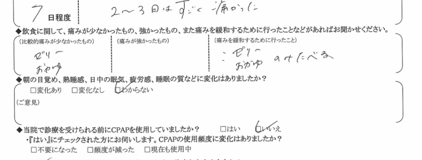 Q.術後、強い痛みは何日程度続きましたか?また、痛みの度合いについて具体的なご意見をお聞かせください。
