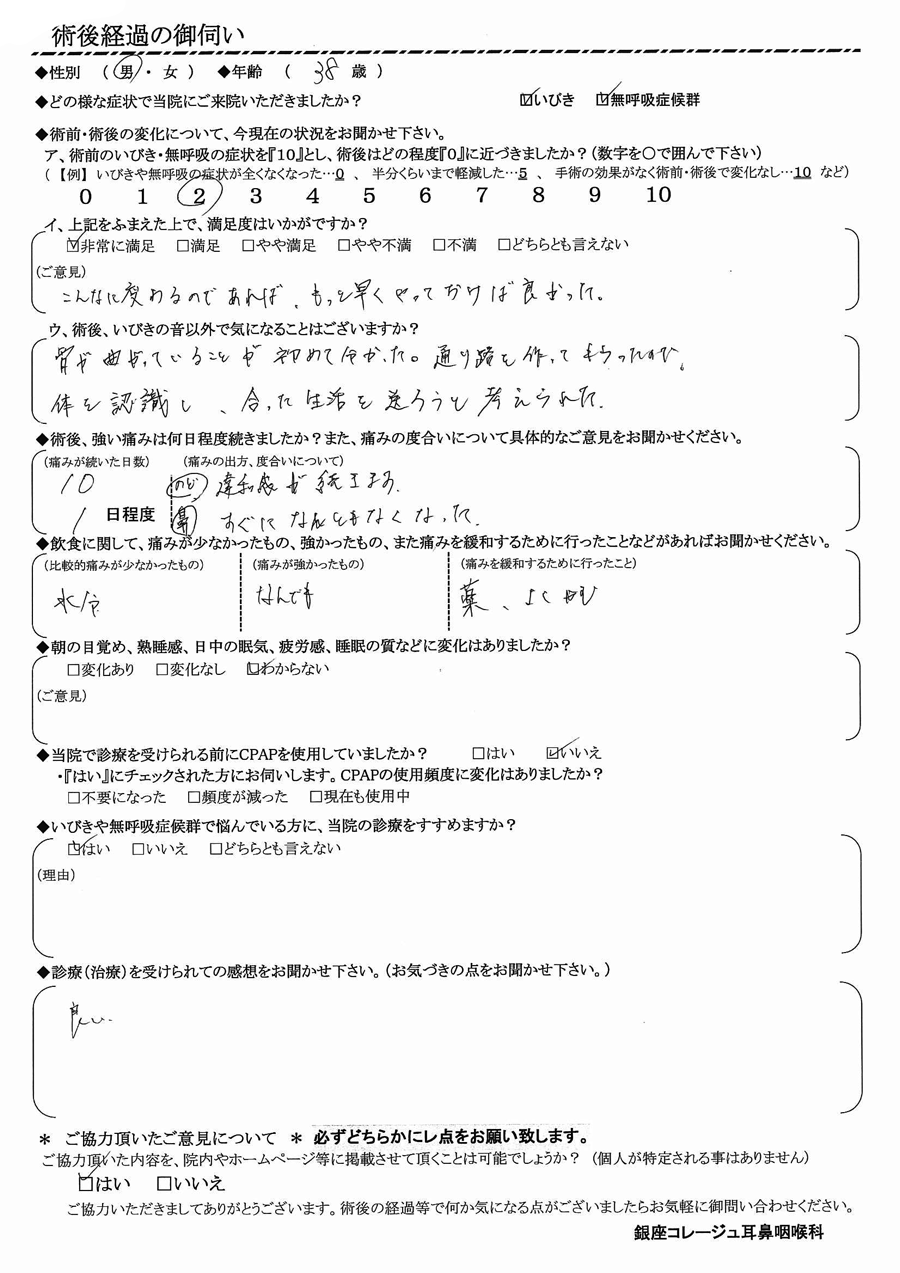 ア, 術前のいびき・無呼吸の症状を『10』だったとすると、術後はどの程度になりましたか? 【2】