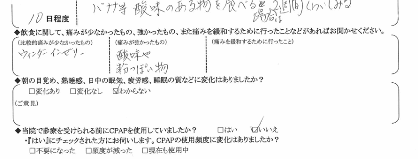 (痛みの程度について) バナナ等、酸味のある物を食べる場合は2週間くらい沁みる。