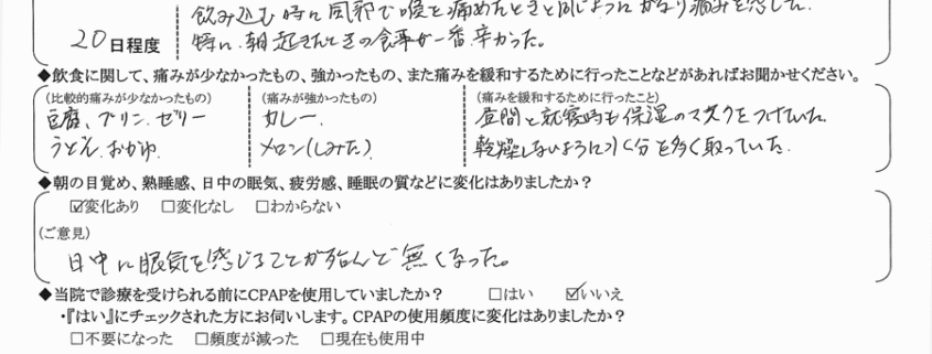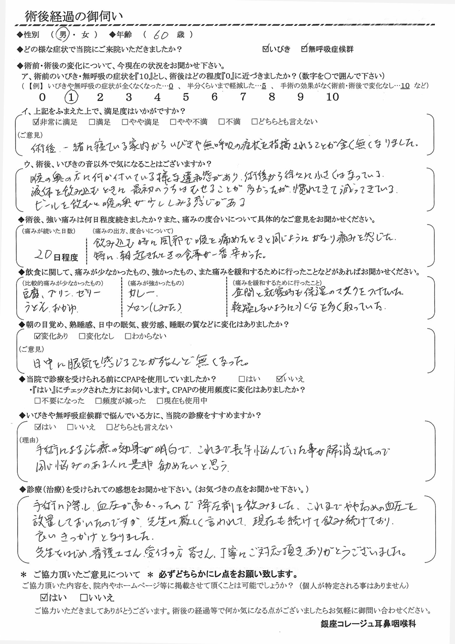 (ご意見) 術後、一緒に寝ている家内から、いびきや無呼吸の症状を指摘される事が全く無くなりました。