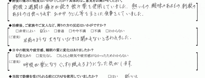 (ご意見) 術後の違和感があるものの大きないびきがなくなり嬉しく思っています。