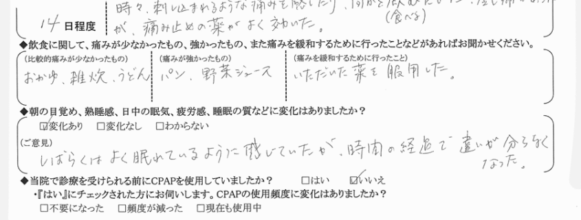 (痛みの程度について) 時々、刺し込まれるような痛みを感じたり、何かを飲む・食べる度に鈍痛があったが痛み止めの薬が良く効いた。