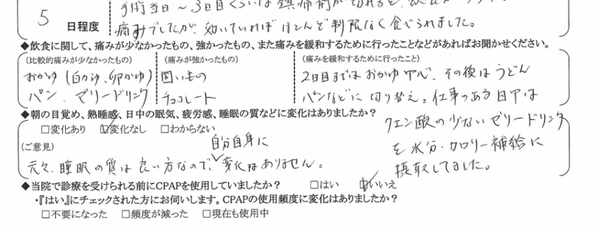 (痛みの程度について) 手術当日~3日目くらいは鎮痛剤が切れると飲食が辛いくらいの痛みでしたが、効いていればほとんど制限なく食べられました。