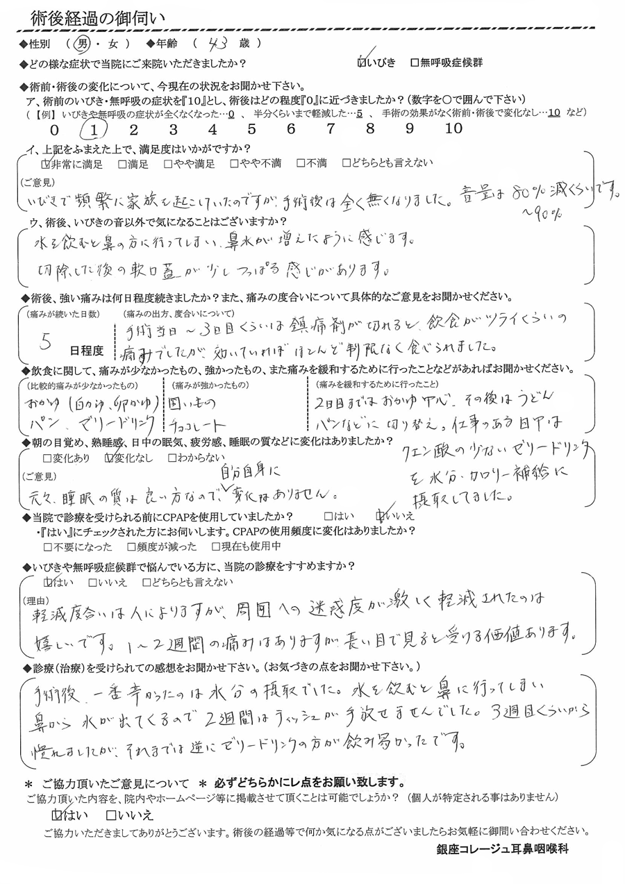 (ご意見) いびきで頻繁に家族を起こしていたのですが、手術後は全く無くなりました。音量は80%~90%減くらいです。