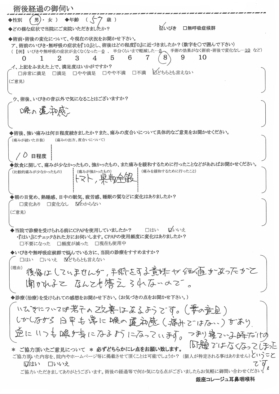 ア, 術前のいびき・無呼吸の症状を『10』だったとすると、術後はどの程度になりましたか? 【8】