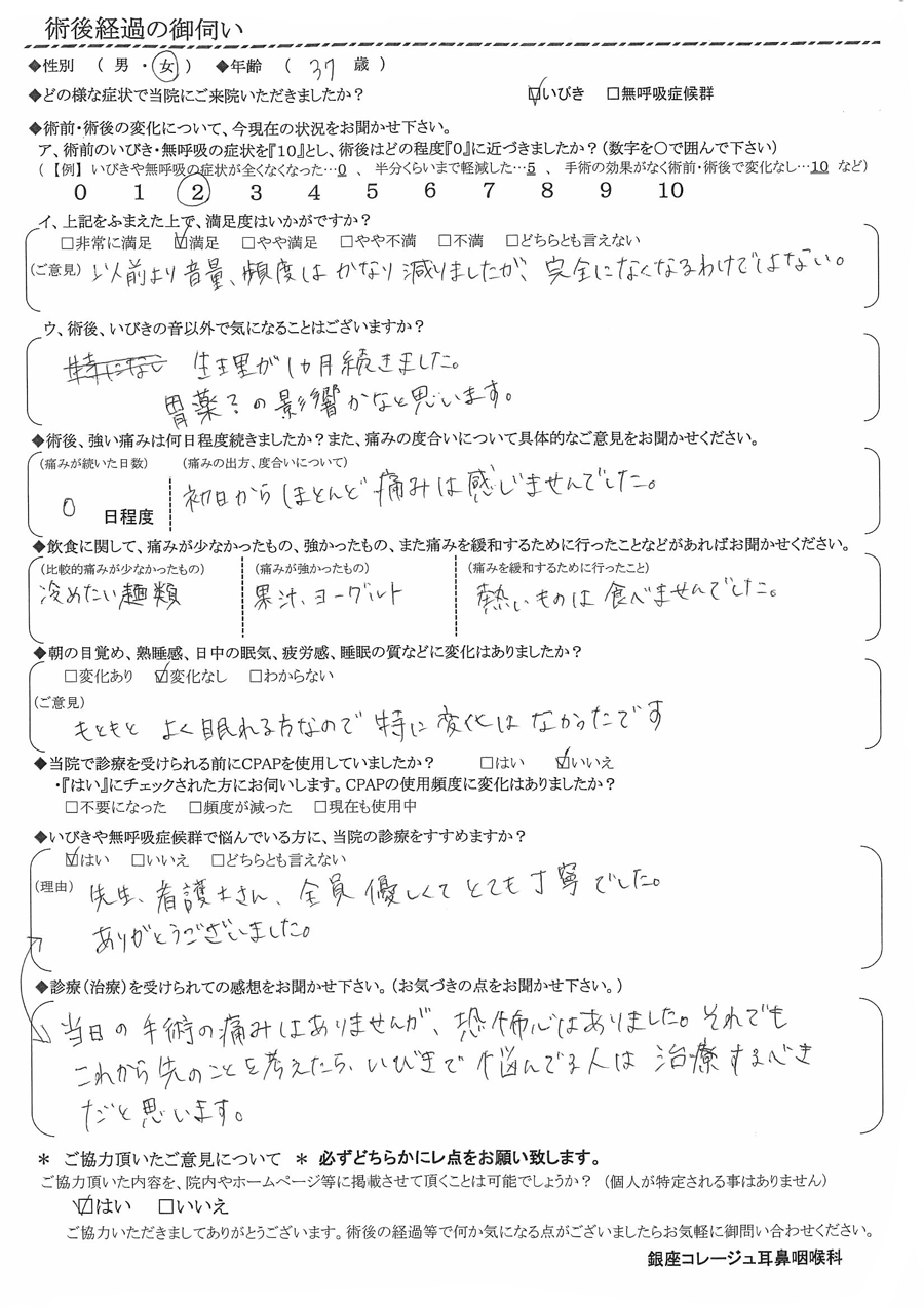 ア, 術前のいびき・無呼吸の症状を『10』だったとすると、術後はどの程度になりましたか? 【2】