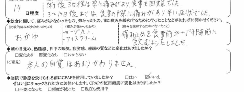 (痛みの程度について) 術後3日程は常に痛みがあり、食事も困難でした。3~14日後までは食事の際に痛みがあり、辛い症状でした。