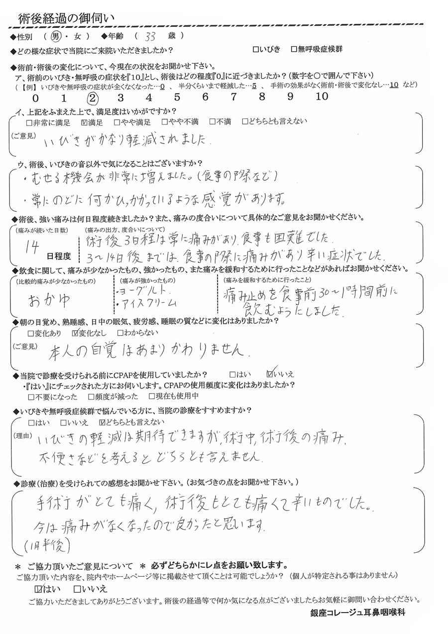(理由) いびきの軽減は期待できますが、術中・術後の痛みと不便さなどを考えると、どちらとも言えません。