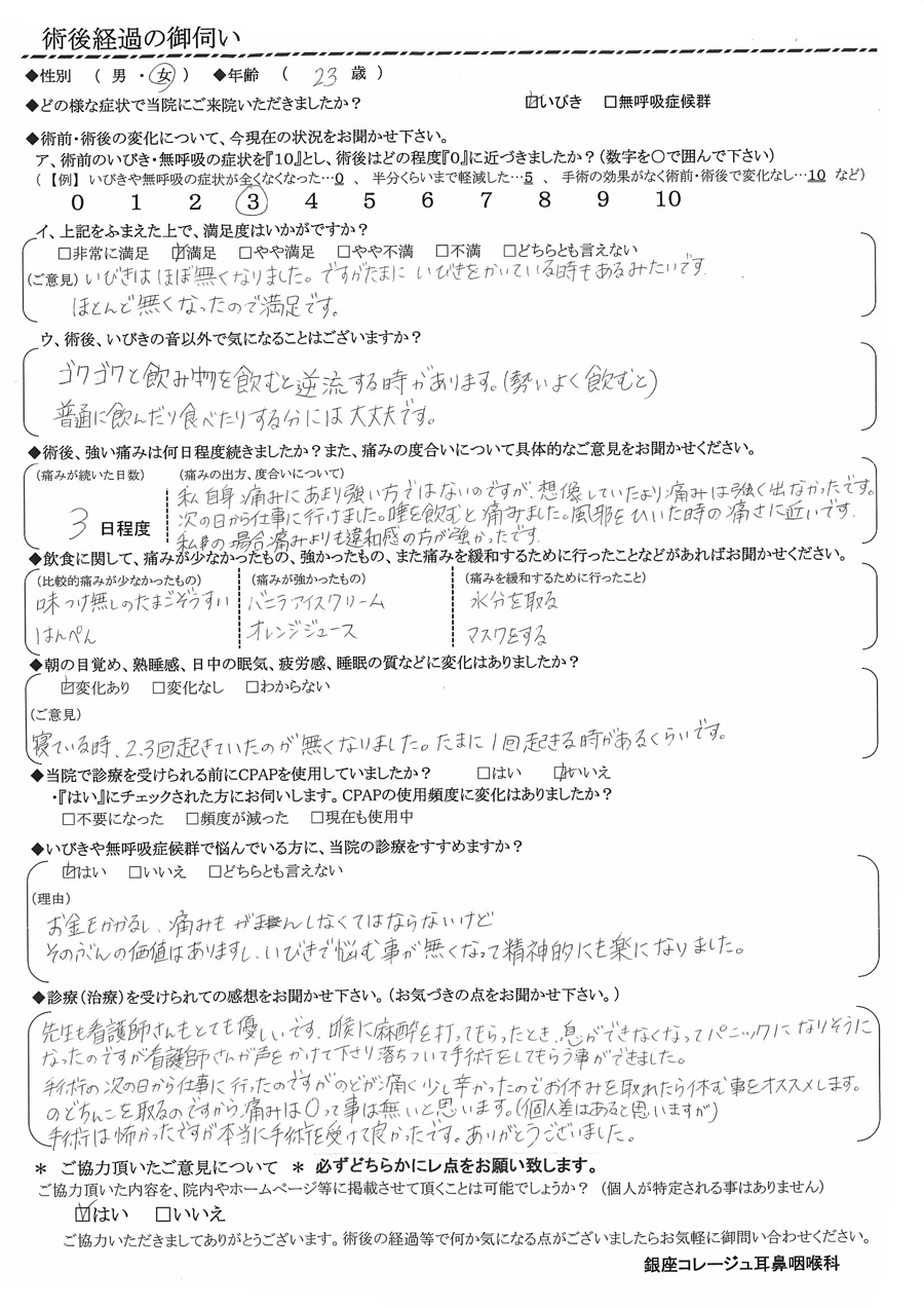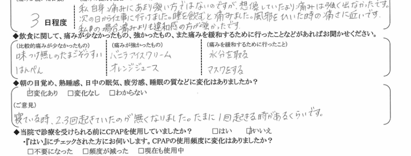 (理由) お金もかかるし、痛みも我慢しなくてはならないけど、その分の価値はありますし、いびきで悩む事が無くなって精神的にも楽になりました。