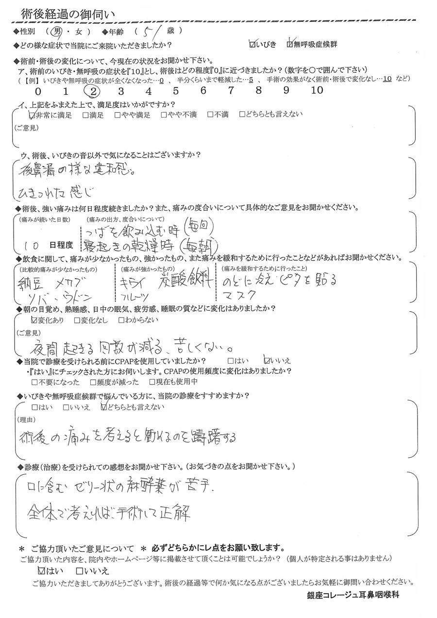 ア, 術前のいびき・無呼吸の症状を『10』だったとすると、術後はどの程度になりましたか? 【2】