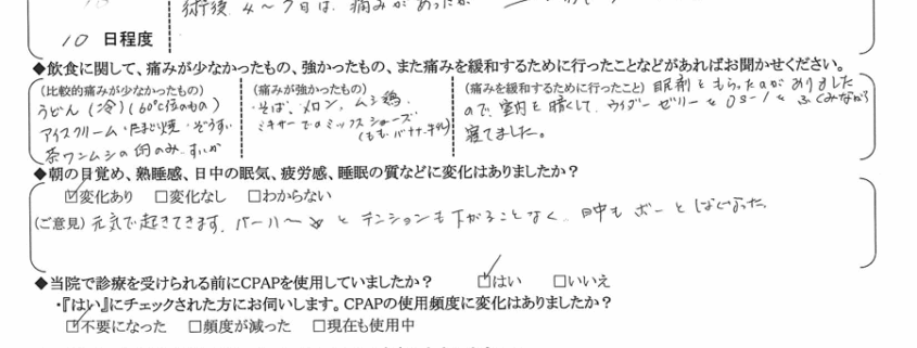 Q.術後、強い痛みは何日程度続きましたか?また、痛みの度合いについて具体的なご意見をお聞かせください。