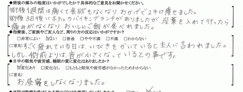 (ご意見) すごく疲れている日はいびきをかいていると主人に言われました。しかし、術前よりは音が小さくなっているとのことです。