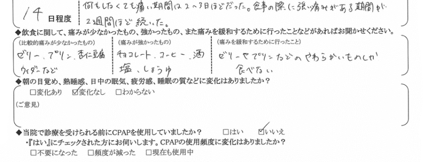 (痛みの程度について) 何もしなくても痛い期間は2~3日程だった。食事の際に強い痛みがある機関が2週間ほど続いた。