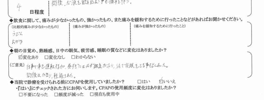 (ご意見) いびき・無呼吸症候群があり、いびき計測アプリで確認したところ、10段階中8~10のスコアであり、録音でもいびきが確認できた。術後、アプリを使いセルフチェックをしたが、スコアが0~2程度まで改善できた。