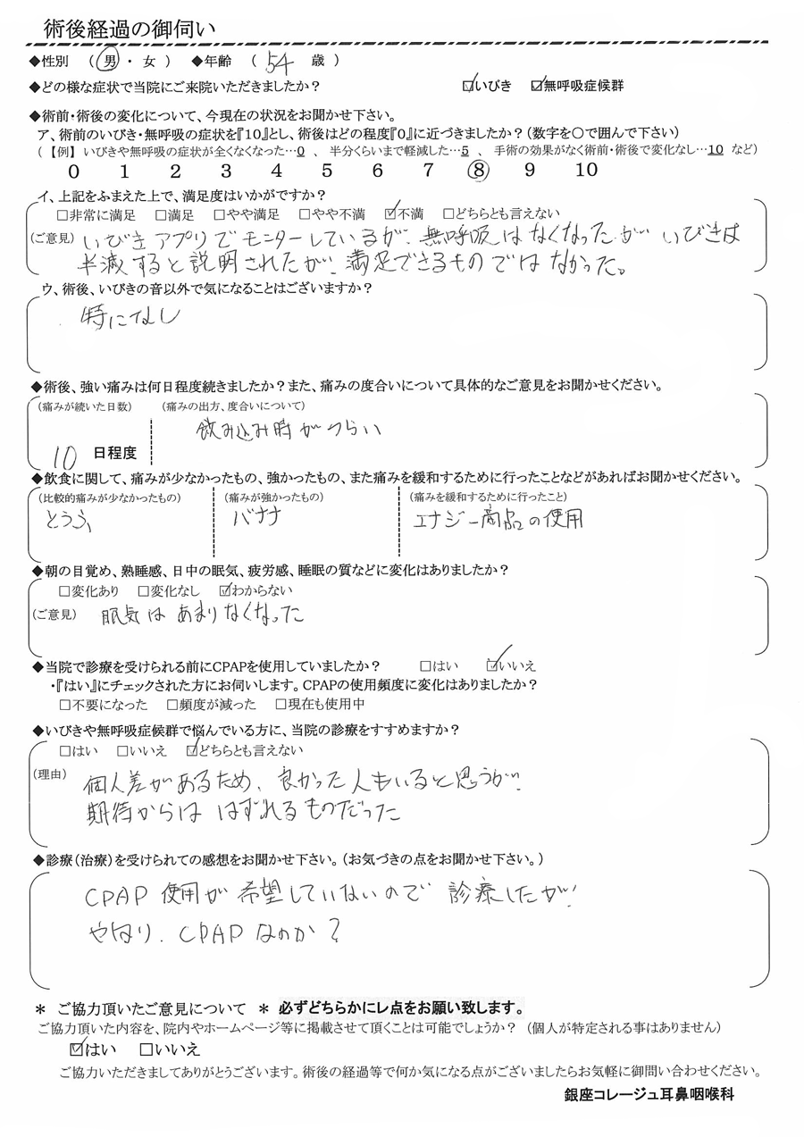 (ご意見) いびきアプリでモニターしているが、無呼吸は無くなったが、いびきは半減すると説明されていたが、満足できるものではなかった。