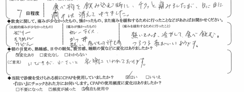 (痛みの程度について) 食べ物を飲み込む時にチクッと痛みましたが、日に日に痛みは消えてゆきました。