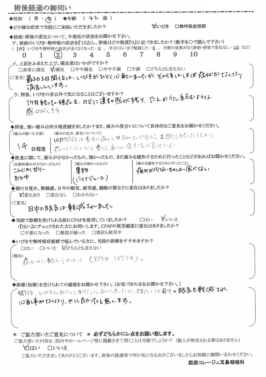 (ご意見) 最初の2日間位は、いびきが酷くて心配していましたが、その後はほぼ症状が無くなり満足しています。