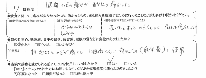 (ご意見) 朝起きると喉が痛くて、1週間くらい痛み止め(坐薬)を使用。