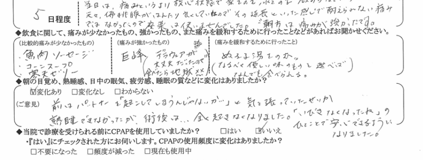 Q.術後、強い痛みは何日程度続きましたか?また、痛みの度合いについて具体的なご意見をお聞かせください。