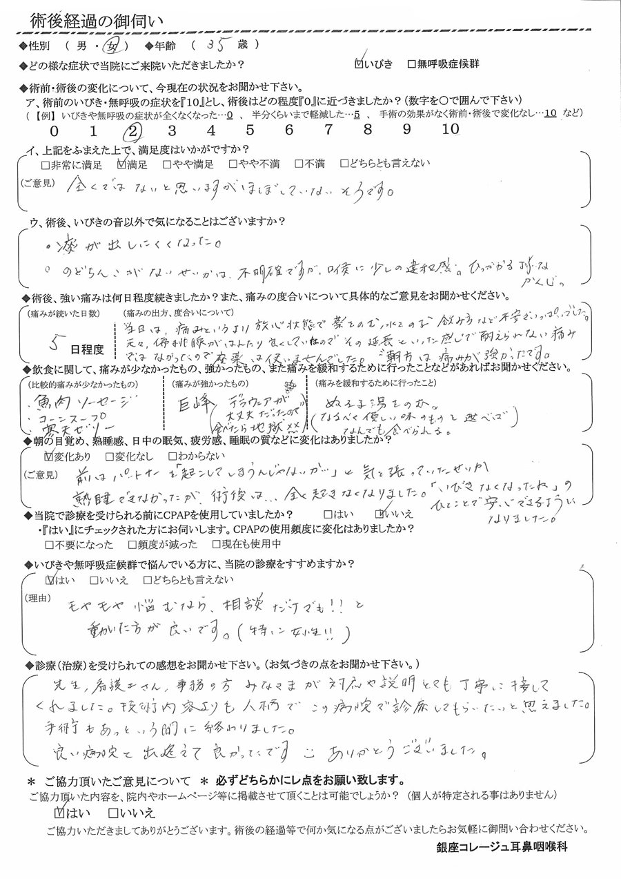 術後は…全く起きなくなりました。「いびき無くなったね」の一言で安心できるようになりました。
