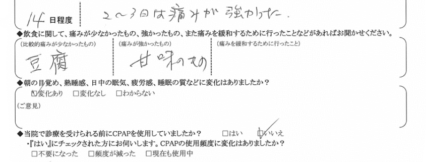 Q.術後、強い痛みは何日程度続きましたか?また、痛みの度合いについて具体的なご意見をお聞かせください。