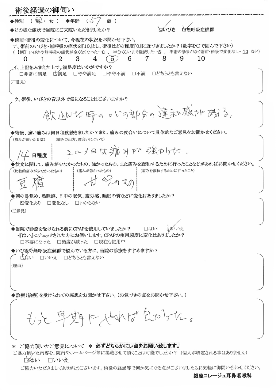 ア, 術前のいびき・無呼吸の症状を『10』だったとすると、術後はどの程度になりましたか? 【5】