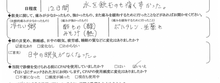 (痛みの程度について) 水を飲むのも痛く、辛かった。