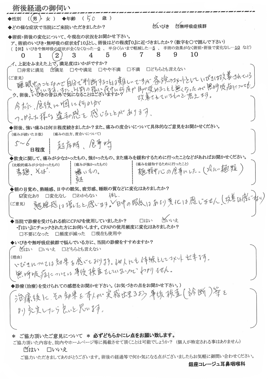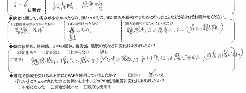 (ご意見) 睡眠中のことなので自分で判断する事は難しいですが、家族のコメントとしてイビキは改善されていると思います。