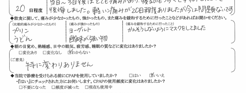 Q.術後、強い痛みは何日程度続きましたか?また、痛みの度合いについて具体的なご意見をお聞かせください。