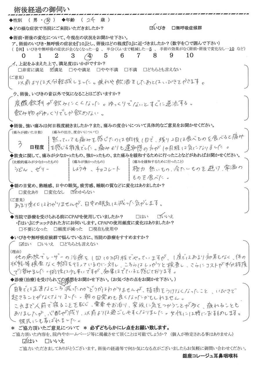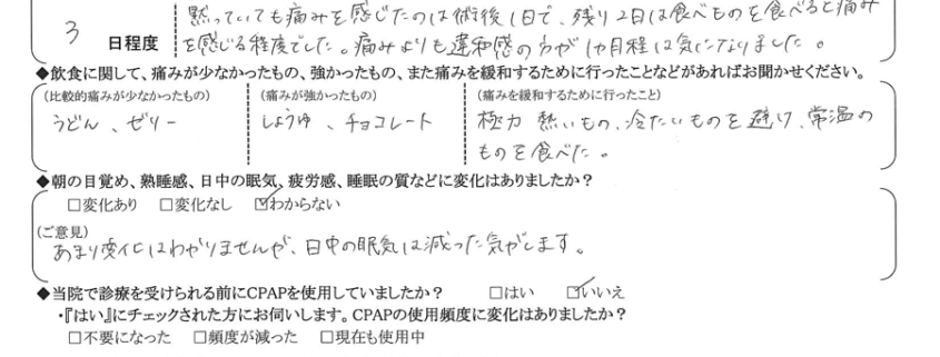 (ご意見) 以前よりは大分軽減しました。疲れや飲酒をしたあとは、いびきをかきます。