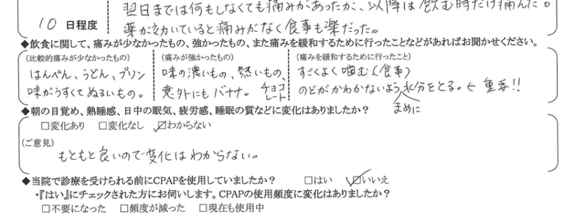 (痛みの程度について) 翌日までは何もしなくても痛みがあったが、以降は飲む時だけ痛んだ。薬が効いていると痛みがなく、食事も楽だった。