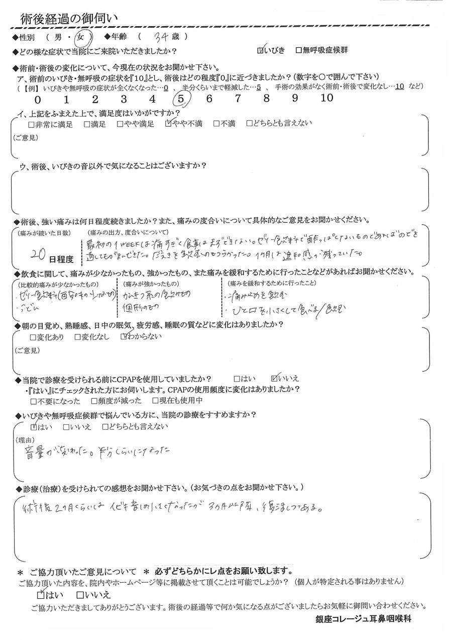 A: 術後2ヶ月くらいはいびき音は小さくなったが、3ヶ月以降、復活しつつある。