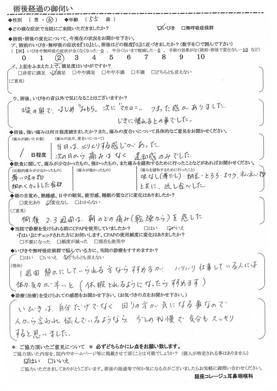 (ご意見) 術後2~3週間は朝の喉の痛み(乾燥から)を感じた。