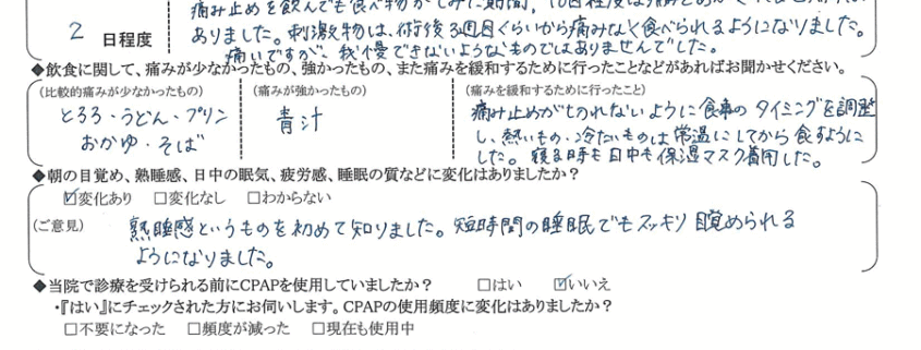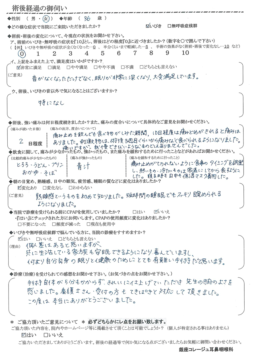 (理由) 個人差はあると思いますが、共に生活している家族も安眠できるようになり喜んでいますし、何より自分自身の眠りと健康のためにとても有難い手術だとおもいます。