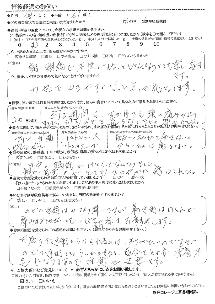 (理由) 喉の手術はかなり痛いですが、鼻の手術はほとんど痛みはありませんので、いびきだけの方にはお勧めします。