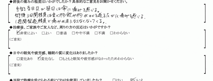術前のいびきは騒音のようなものだったので、その点を鑑みると非常にすばらしい手術だと思います。