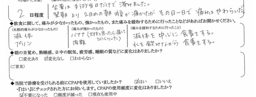 Q.術後、強い痛みは何日程度続きましたか?また、痛みの度合いについて具体的なご意見をお聞かせください。