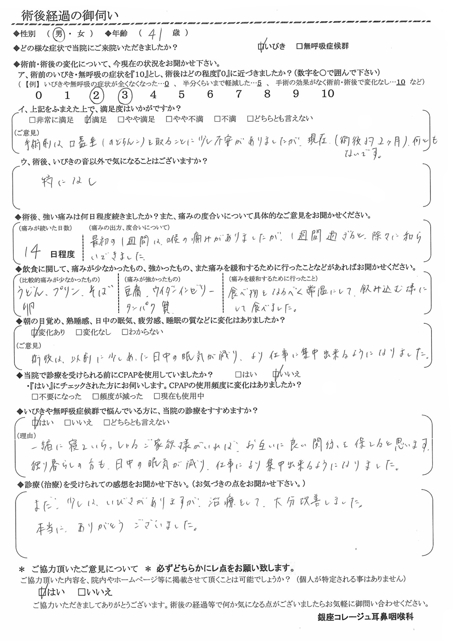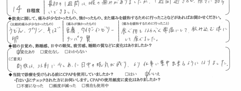 (ご意見) 術後は以前に少しあった日中の眠気が減り、より仕事に集中できるようになりました。
