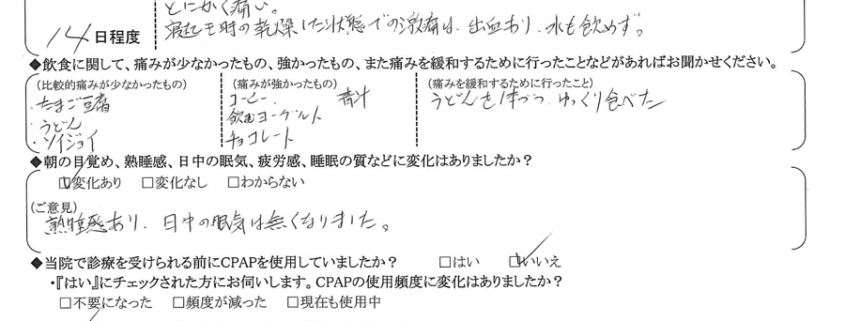 (ご意見)  熟睡感あり。日中の眠気は無くなりました。