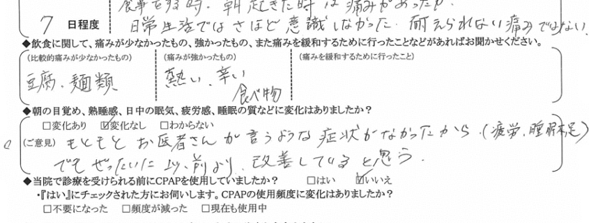 (痛みの程度について) 食事をする時と朝起きた時は痛みがあったが、日常生活ではさほど意識しなかった。