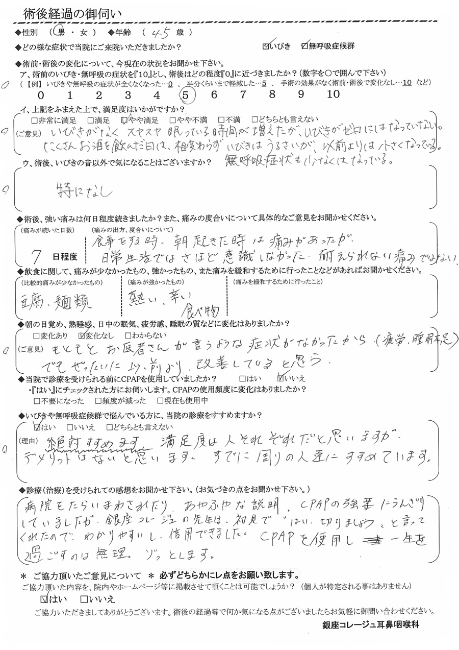 A: 病院をたらい回されたり、あやふやな説明、CPAPの強要にうんざりしていましたが、銀座コレージュの先生は初見で“はい、切りましょう”と言ってくれたので、分かりやすいし信用できました。CPAPを使用し一生を過ごすのは無理。ゾッとします。