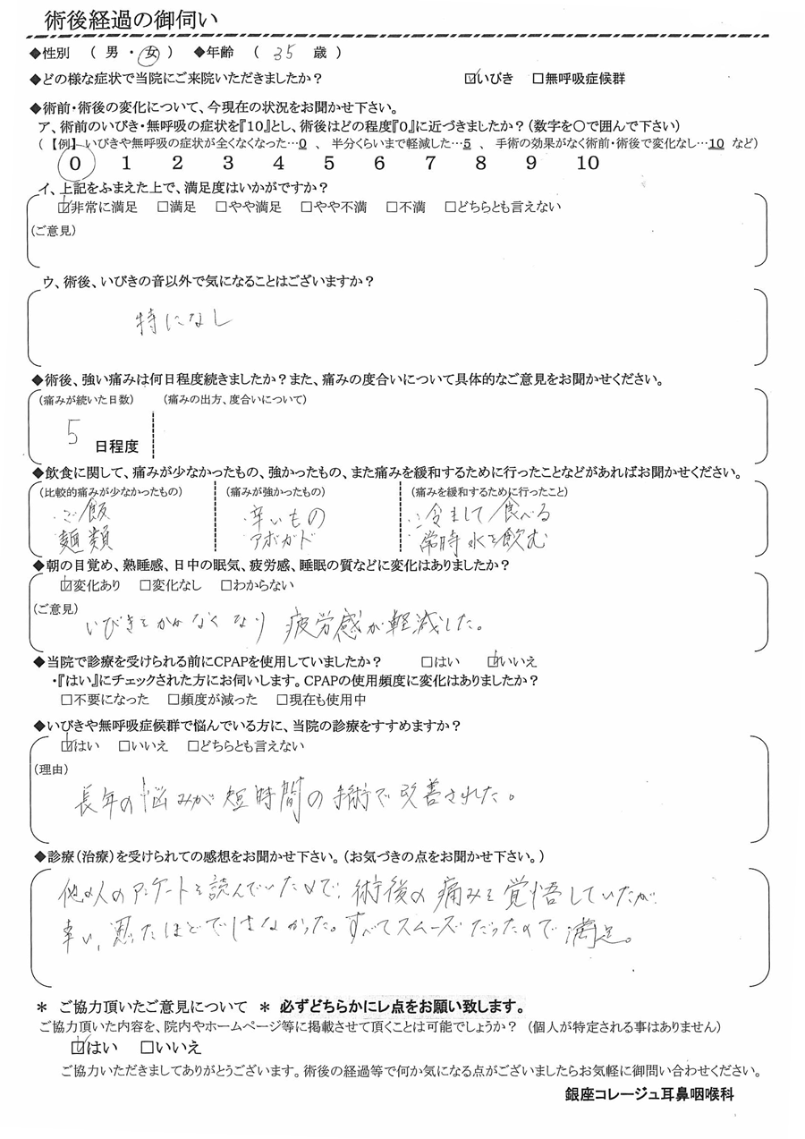 ア, 術前のいびき・無呼吸の症状を『10』だったとすると、術後はどの程度になりましたか? 【0】