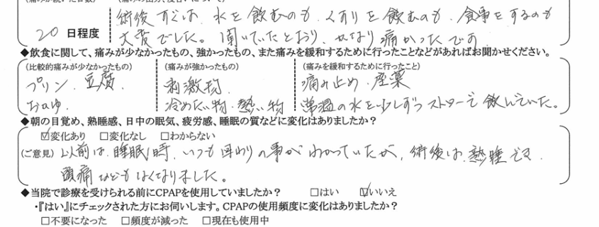 (ご意見) 以前は睡眠時、いつも回りの事がわかっていたが、術後は熟睡でき、頭痛などもなくなりました。